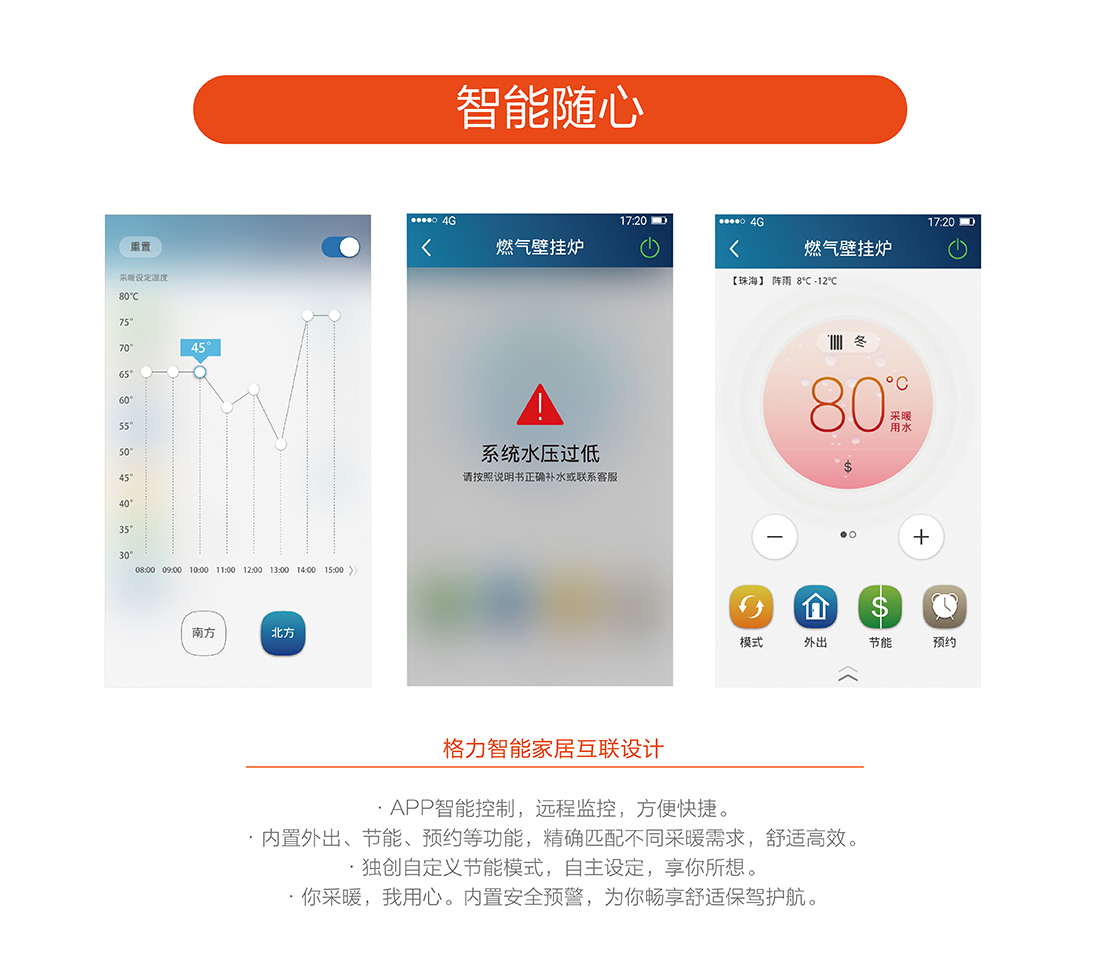 全預混燃燒結(jié)合雙寬域功率調(diào)節(jié),節(jié)能恒溫,溫差在±0.5℃之間,保證熱水四季恒溫快速出熱水,減少水流浪費,生活水溫度35-60℃,采暖水溫30-80℃